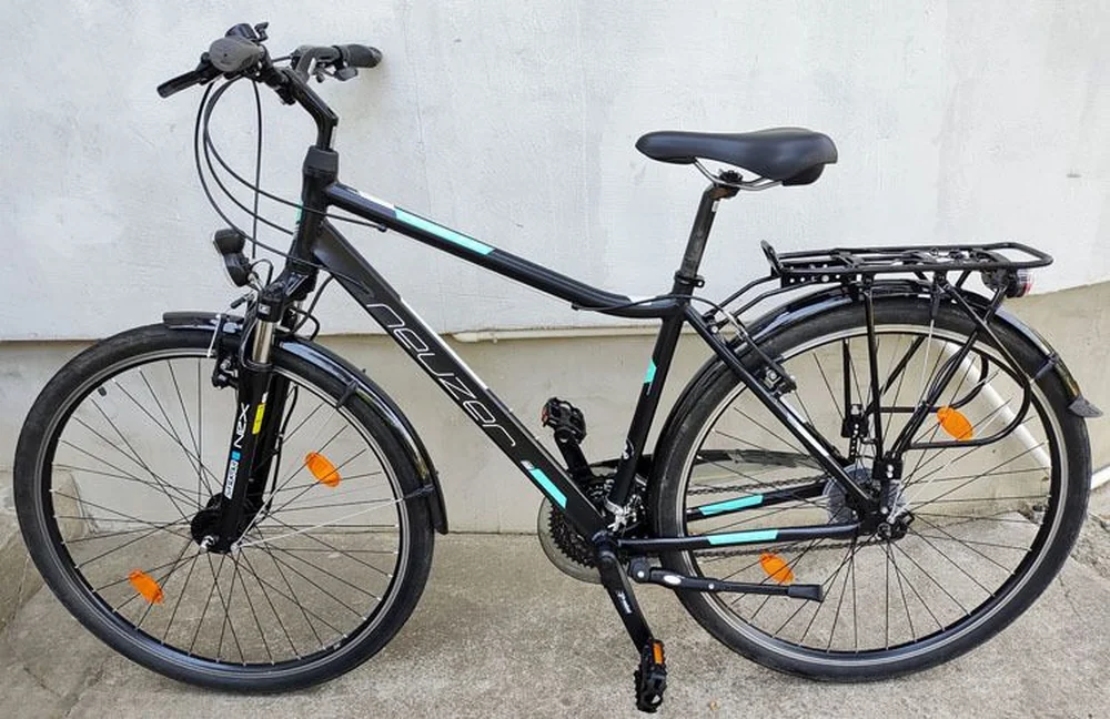 Málo používaný ako nový cestný trekingový bicykel NEUZER RAVENNA 100. Predná teskopická vidlica SR SUNTOUR NEX CR-8V. 28" hliníkové kolesá so zpevnenými ráfikmi, plášte: 700x42C. 19" hliníkový ALU rám AL6061 pre výšku postavy: 172 - 185 cm. Na riadítku páčkové radenie prevodov: SHIMANO TY500 V-BRAKE. Predný prešmykač: SHIMANO TOURNEY. Zadná prehadzovačka: SHIMANO TOURNEY SIS. 3x7 prevodov. Vpredu aj vzadu V-brzdy ALHONGA. Predný pohon - ozubené kolesá: PROWHEEL MY-641 28/38/48T. Vpredu AN LUN aj vzadu AXA LED svetlá na dynamo (6V 3W) zabudovaným v náboji predného kolesa. Zadný masívny kovový batožinový nosič, max. 25kg. Gelové sedlo SELLE ROYAL. Hliníkové blatníky v čiernej farbe. Odrazky v kolesách. Zvonček. Stojan. Hliníkové kľuky PROWHEEL. Plastové pedále.