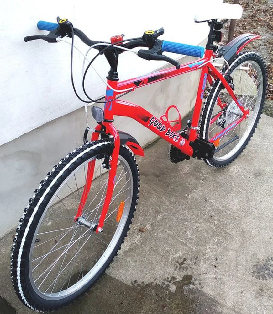 Krásny červený cestný bicykel GOOD BIKE OKLAHOMA. 19" oceľový rám (48), pre výšku postavy: 165 - 178 cm. 26" kolesá, plášte KENDA s bielymi reflexnými pruhmi, rozmery: 26 x 2,10. Počet prevodových stupňov: 3x6 = 18 rýchlostí. Na riadidlách páčkové 3 a 6-stupňové otočné neindexové radenia - SAIGUAN. Predná prehadzovačka - prešmykač: SAIGUAN SG 42T. Zadná prehadzovačka: SAIGUAN. Vpredu aj vzadu V-brzdy: SAIGUAN. Rýchloupínacia sedlovka. Hmotnosť bicykla: približne 15 kg. Odrazky na ráme bicykla aj v kolesách. Držiak na fľašu. Stojan. Zvonček. Plastové blatníky.