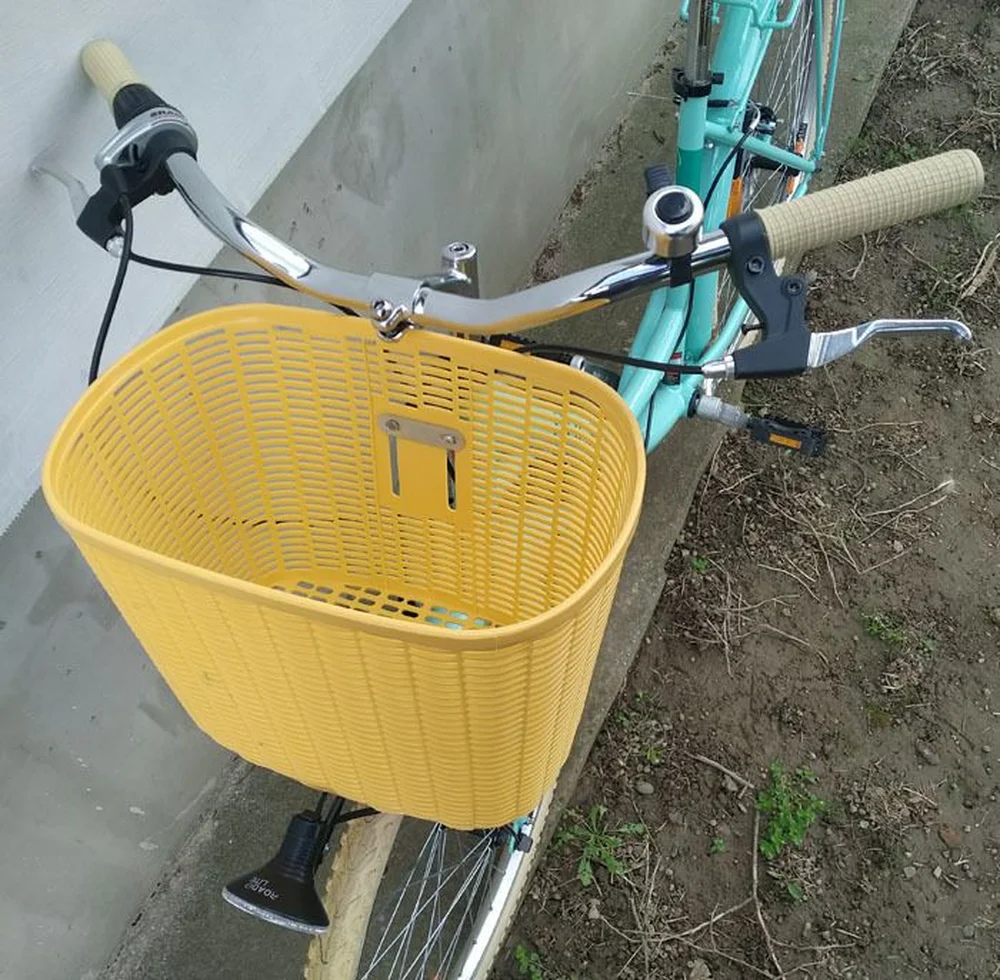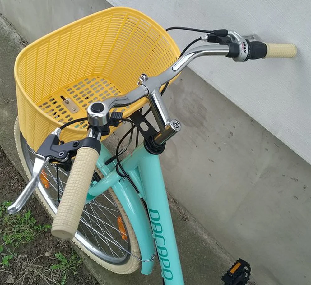 Nový elegantný dámsky mestský bicykel DACAPO vpredu s plastovým košíkom.