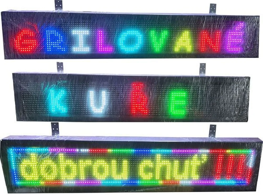 Atraktívny svetelný programovateľný led panel na zobrazovanie ľubovoľného reklamného textu. Výber zo 7 farieb: červená, purpurová, zelená, biela, tmavomodrá, svetlomodrá, žltá. Ľubovoľne farebne sa dá nastaviť samostatne každé písmeno alebo slovo alebo celé vety. Pre lepšie zvýraznenie súčasne sa farebne dá nastaviť aj pozadie. Napr. Na bielom pozadí beží tmavomodrý text.