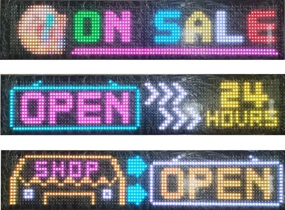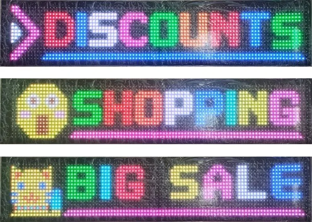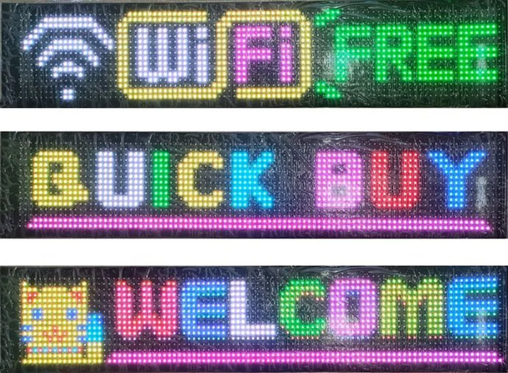Najnovšia plnofarebná programovateľná svetelná LED tabuľa reklama pútač s rozmermi 90 x 19,2 cm s diaľkovým ovládačom.