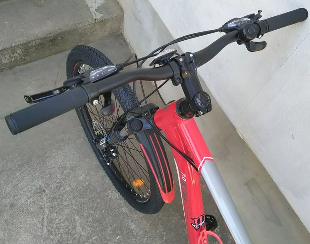 Odprúžený horský MTB KIM Ride M-RACE 7.0. Predná teleskopická vidlica SR SUNTOUR XCE28. 27,5" hliníkové kolesá so zpevnenými ráfikmi, plášte: 27,5 x 2,125. 17,5" ALU hliníkový rám, pre výšku postavy: 168 - 182 cm. Sedlovka KIM RIDE s rýchloupínaním. Páčkové radenie prevodov na riadítku: SHIMANO V-BRAKE. Predný prešmykač:Shimano Tourney. Zadná prehadzovačka: Shimano ALTUS. 7x3 prevodov. Vpredu aj vzadu mechanické kotúčové brzdy LOGAN. Plastové blatníky. Odrazky na ráme aj v kolesách. Držiak na fľašu. Hliníkové kľuky PROWHEEL. Zvonček. Stojan. Všetko presne podľa obrázkov.