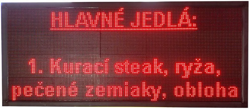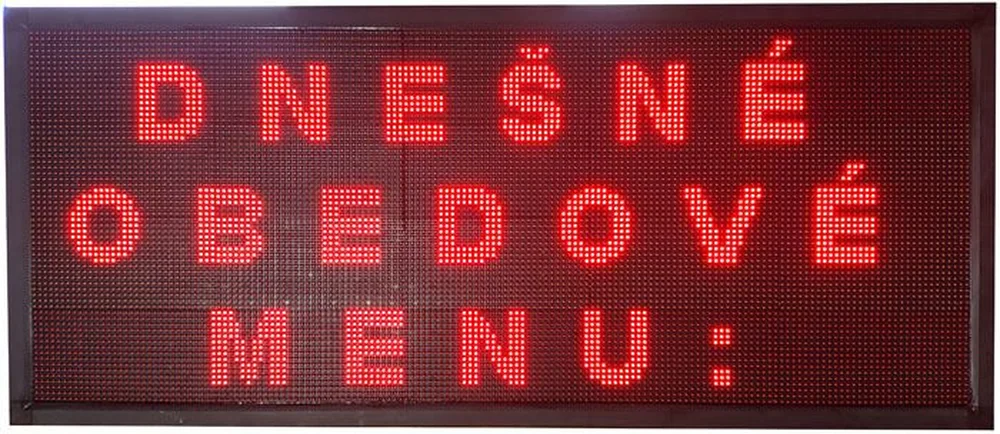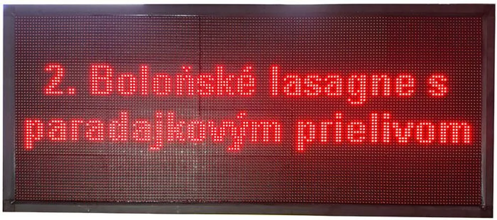 Svetelný programovateľný LED panel a zobrazovanie ľubovoľného reklamného textu. Rozmery: 168 x 72 x 9cm. Priťahuje pohľady + výborná čitateľnosť aj z väčšej vzdialenosti. Vynikajúca viditeľnosť aj za denného svetla. Jednoduché programovanie. Veľa možností upravenia textu: rýchlosť zobrazovania, efekty, bežiaci rám a pod. Panel zobrazuje okrem bežiaceho textu aj rôzne jednoduché obrázky či obrazové efekty GIF animácie. Text sa dá rozdeliť do 2-3-4 riadkov alebo na ľavú a pravú časť podľa potreby. Napr. v jednom okamihu na LED panely beží jednoriadkový text v plnej veľkosti 64cm, v druhom okamihu na LED panely bežia dva texty a každý riadok môže mať: inú rýchlosť nezávisle od seba, typ písma alebo rôzne svetelné efekty. Priemerna spotreba: 180W, váha: 18kg. Programovanie prebieha pomocou programu, ktorý sa dodáva s panelom.